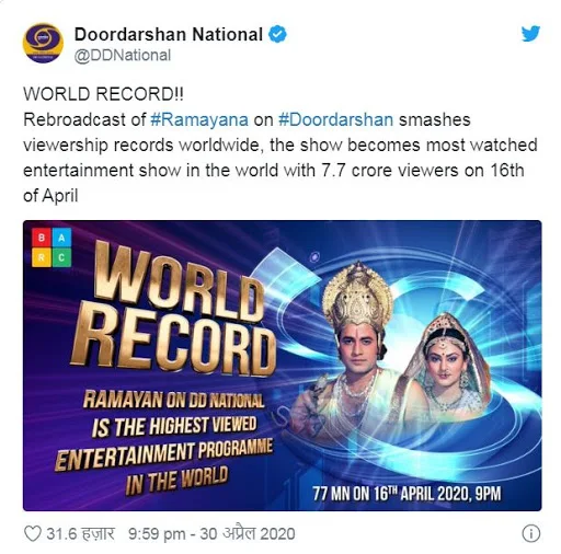 ट्वीट में लिखा है - विश्व रिकॉर्ड, दूरदर्शन पर रामायण के पुन: प्रसारण ने दुनियाभर में व्यूअरशिप के रिकॉर्ड तोड़ दिए हैं। यह शो सबसे ज्यादा देखा जाने वाला शो बन गया है। जिसे 16 अप्रैल को 7.7 करोड़ दर्शकों ने देखा।